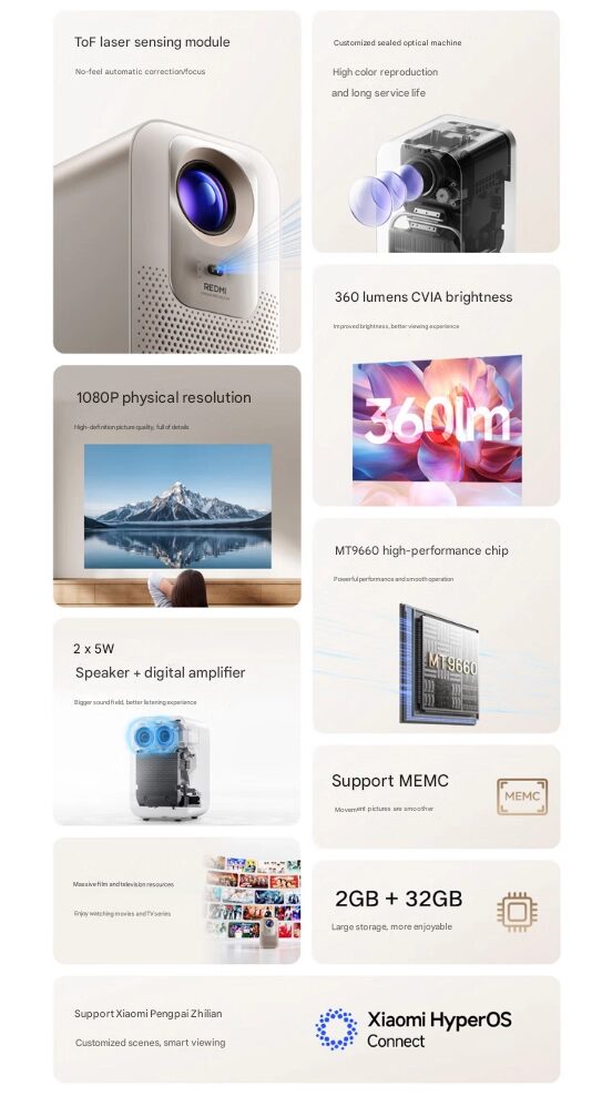 پروژکتور Redmi 4 شیائومی با موتور نوری مهر و موم شده روشنایی ۳۶۰ لومن CVIA ارائه می‌دهد و تصاویر واضح و رنگارنگ حتی در اتاق‌های روشن ایجاد می‌کند.